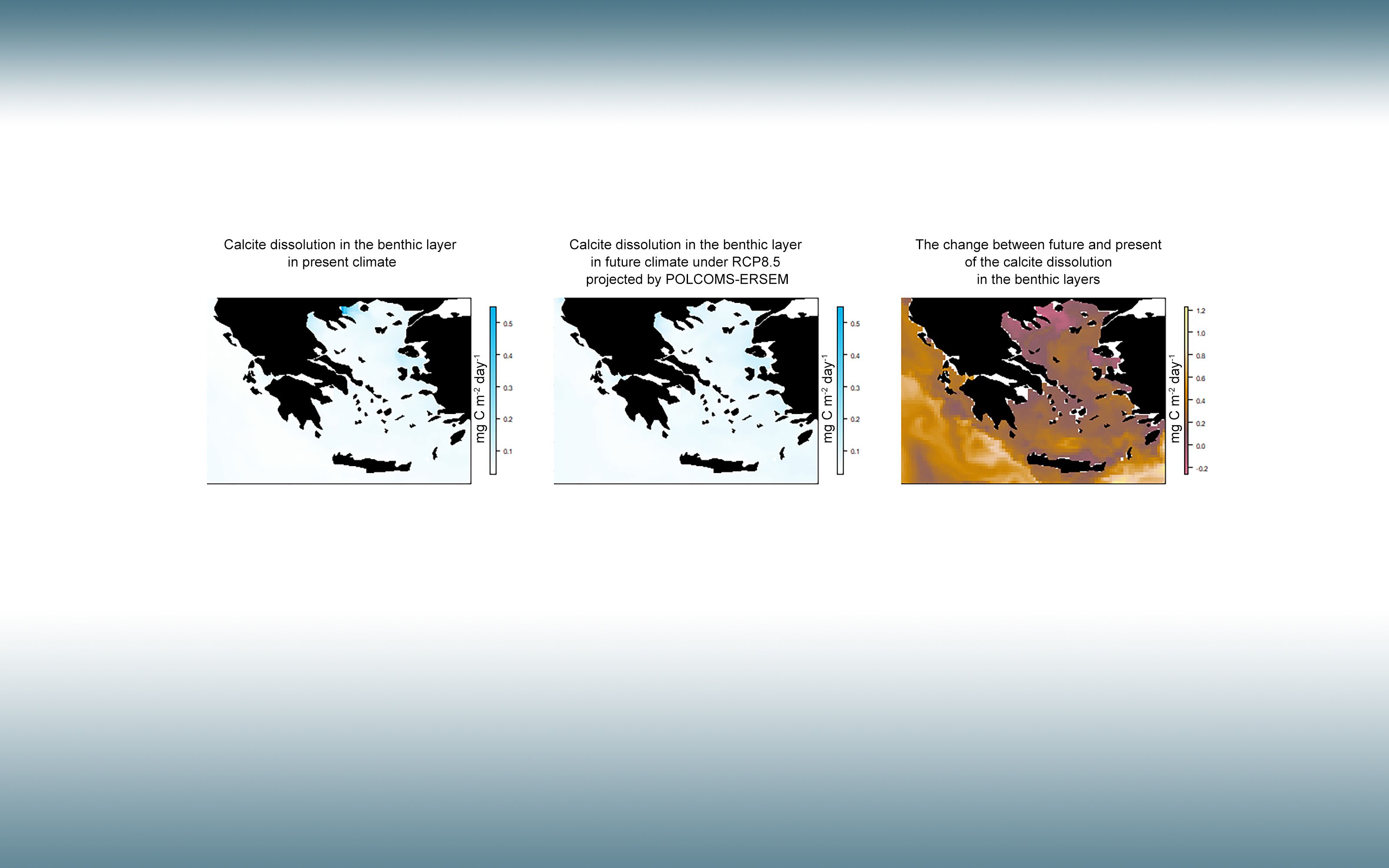The chart highlights the extent of the change. It shows the calcite dissolution in the benthic layer that is likely to decrease with up to 2 mg C m-² per day in a future climate under RCP8.5 projected by POLCOMS-ERSEM, a coupled ocean-ecoystem model.